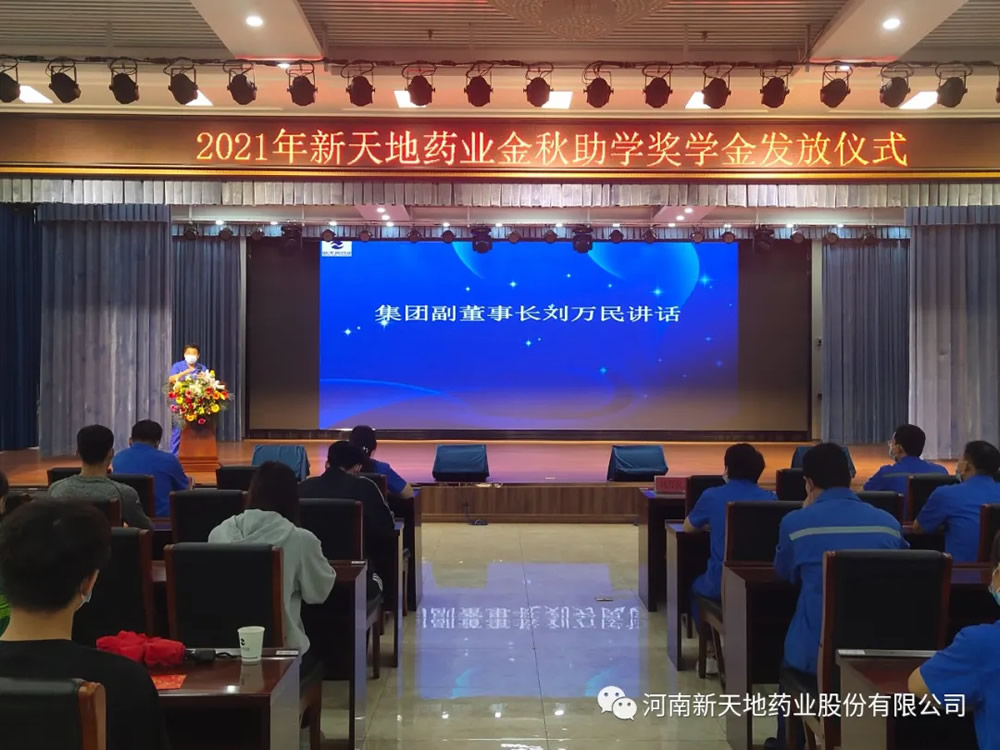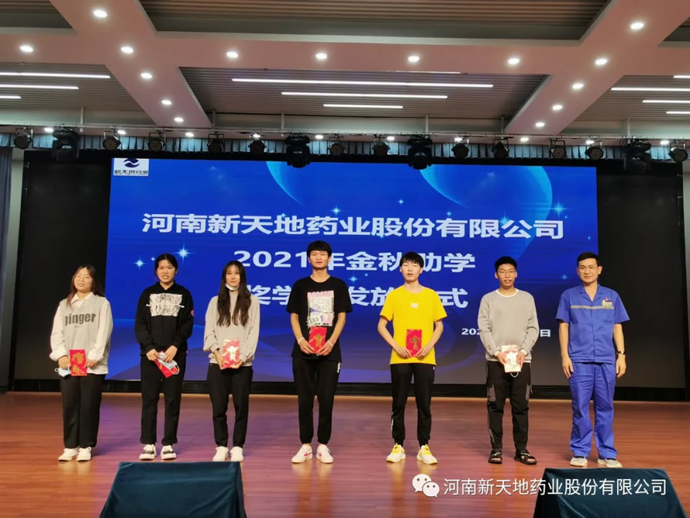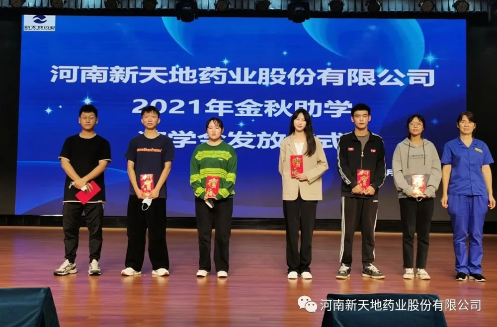 公司秉承“赢商载道,厚积尚德”价值观,履行企业的社会责任,践行尊师重教理念,坚信“知识改变命运”助学回报乡梓,开展金秋助学等多种活动支持关注员工子女成长发展,从有记录可查的2012年至今已累计捐助近30万元,近百名员工子女受到资助,很多新天地药业子弟带着新天地人的殷殷期望,迈入社会成长为中坚力量在各行各业大展宏图,为理想而拼搏。